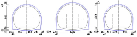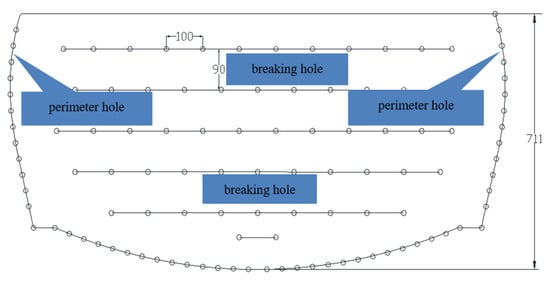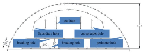 The overall construction plan is to excavate the left line first, followed by the right line and the middle line. This is to select a reasonable tunneling scheme according to the parameters involved []. The surrounding rock of grade III is constructed by bench blasting. The upper and lower steps are staggered by 5~8 m, and the second lining is 51~80 m away from the tunnel face. The surrounding rock of Grade V adopts the temporary transverse support method of three steps, the construction interval of the upper, middle and lower steps is 3~5 m, and the second lining is not more than 70 m away from the tunnel face. Emulsified explosives and plastic detonators are selected as blasting equipment. Millisecond differential initiation is used for blasting. The section size and spacing of the three holes are shown in Figure 3.