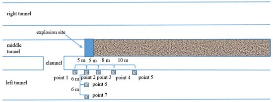 A total of seven measuring points are arranged for the vibration test, and their positions are shown in Figure 6. The mileage corresponding to the face of the middle hole is DK68+158, and the thickness of the wall is 6 m. Measuring point 2 is on the same plane as the charging section on the tunnel face. Measuring point 1 is set in the excavated stage of the middle tunnel, 5 m away from measuring point 2. Measuring points 3, 4, and 5 are set in the unexploded area of the middle tunnel. The distances from measuring point 2 are 5 m, 13 m and 23 m. Measuring points 6 and 7 are on the same plane with measuring point 2, but 0.8 m lower than that of measuring point 2. By monitoring the vibration velocity of the measuring point in the same plane and a measuring line, the propagation law of blasting vibrations in different positions is analyzed.