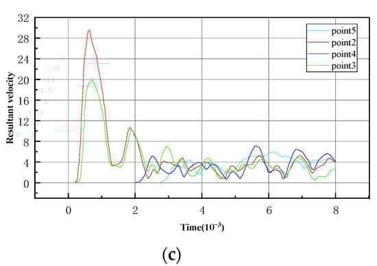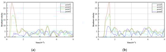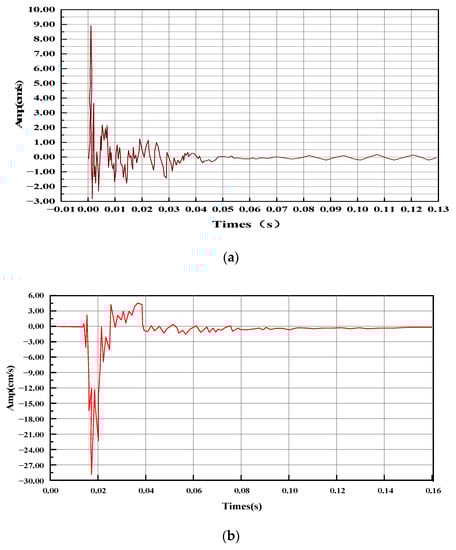 - With the increase in time, the blasting stress wave continues to propagate and reflect in the medium, and reaches a maximum value of 30.55 cm/s in Figure 18d. At this time, the blasting load has been unloaded and then vibrates. The peak value of dynamic velocity decreases gradually until it approaches 0.