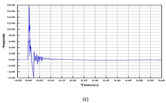It can be seen from Figure 29 that the vibration acceleration of the measuring point at the arch foot of section 0 on the blasting side of the left tunnel is the largest, followed by the measuring point at the tunnel hance, and the peak value of vibration acceleration of the vault is the smallest. By analyzing the change of the blasting vibration acceleration, the resultant force change law of the blasting side can be directly observed: the blasting vibration acceleration at the arch foot is the largest, indicating that the outside lining of the blasting side has the largest detonation force.