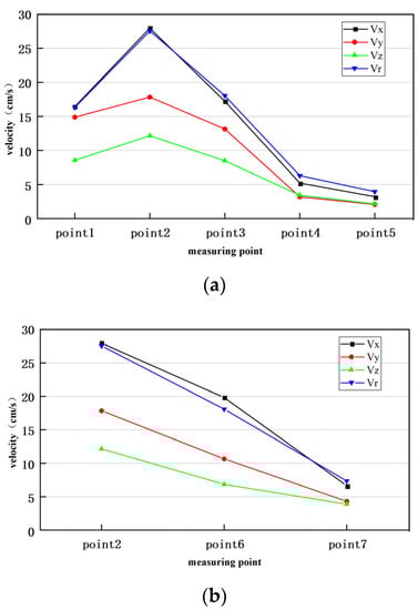 The velocity changes in each direction of each measuring point are plotted according to Table 1, as shown in Figure 8.