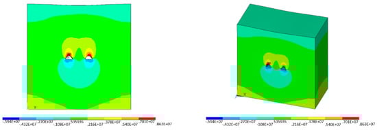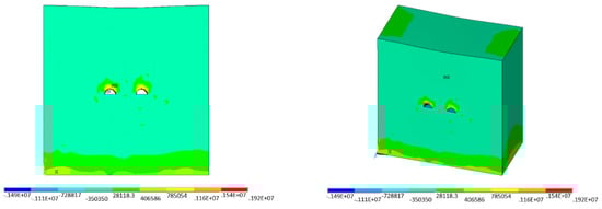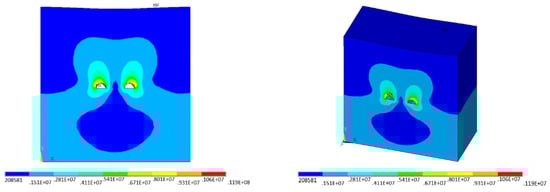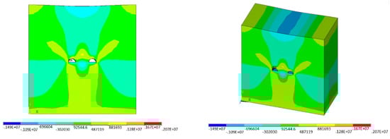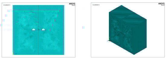 This paper is based on the ANSYS/LS-DYNA finite element program to simulate the dynamic response of existing tunnels to blasting. In the separation section of three holes in this paper, the main tunnel is 11.7 m high and 14.0 m wide, and the tunnels on both sides are 11.1 m high and 12.6 m wide. The net distance of the tunnel is 6 m. Therefore, the selected boundary size of the model is 200 m horizontally, 196 m vertically and 100 m vertically, that is, the model size is 200 m × 196 m × 100 m, as shown in Figure 9. The uncoupled charging structure is adopted. At the same time, the 3D model is set to no reflective boundary, so that the influence of reflection on the solution can be avoided when the wave reaches the interface. Finally, non-reflective boundary conditions are applied to the front, back, left, right, and lower boundaries of the model.