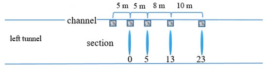 This paper mainly studies the effect of the blasting construction of an excavated tunnel on existing tunnels. The dynamic response rules of blasting excavation at different positions and fault faces on the same section were studied, taking a cross-section in the same plane with the tunnel face, which is called section 0, and four cross-sections behind the tunnel face. These sections have the same longitudinal monitoring points. They are section 5, section 13 and section 23, as shown in Figure 10. Figure 11 shows the measuring point of section 0, and other sections are consistent with it. The comparison between the numerical simulation and measured vibration velocity is shown in Table 8.