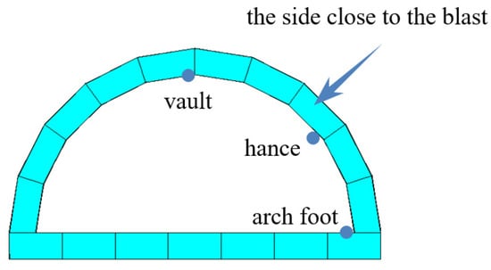 - On the inside of the lining (the side contacting the tunnel headroom), the vibration continues from the arch foot along the tunnel lining towards the vault and tunnel bottom. On the outside of the lining (the side contacting the surrounding rock), the lining on the blasting side is affected by vibration before the back side at the initial stage of blasting. The vibration velocity in the order of large to small is arch foot, tunnel hance, and vault.