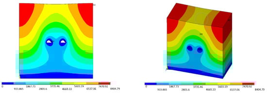 - At the initial stage of blasting load, the lining of the blasting side of the existing left tunnel is affected by vibration first, and a vibration velocity circle is formed. The vibration velocity of the vibration velocity circle is relatively small, and the scope of action is not large, as shown in Figure 18a,b. The vibration velocity of the arch foot in the vibration velocity circle is the largest.