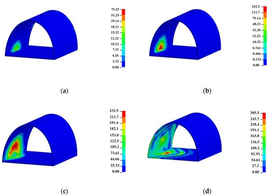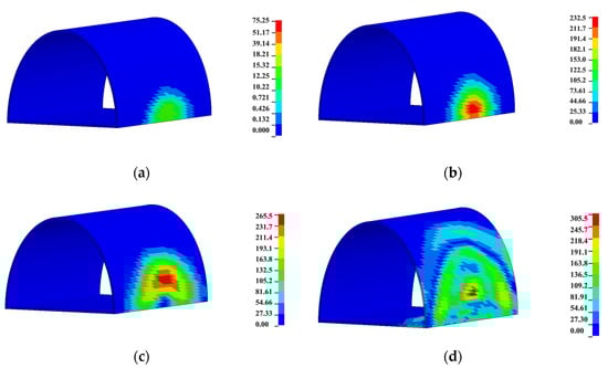 Cloud picture of vibration velocity distribution of external lining: (a) 1 ms; (b) 3 ms; (c) 5 ms; and (d) 7 ms.