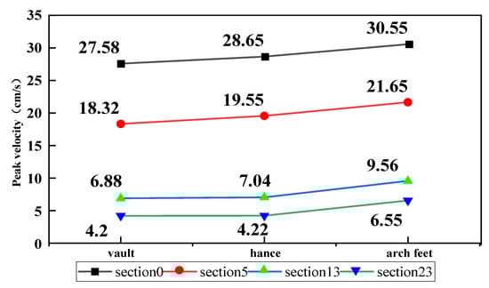 The vibration velocities of the measured points at each monitoring section are shown in Table 9, and the variation of peak vibration velocity is shown in Figure 19.