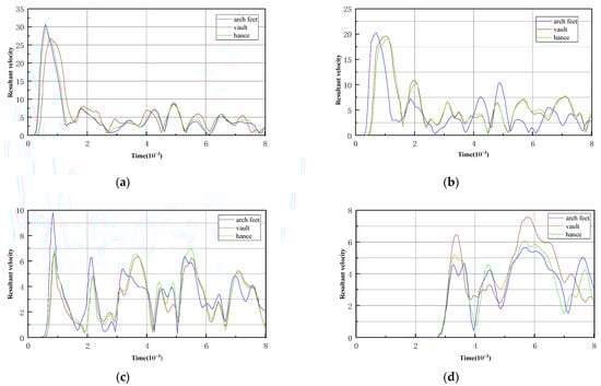 The vibration waveform of four cross-section measuring points: (a) Section 0; (b) Section 5; (c) Section 13; and (d) Section 23. (unit: cm/s).