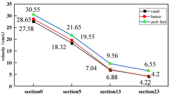 - The vibration velocity is the largest at the arch foot of the blasting side lining of the existing tunnel. The velocity of hance is slightly smaller than that of arch foot but larger than that of vault. As section 0 is very close to the detonation source, the vibration speed reaches 30.55 cm/s, but it rapidly decreases to 6.55 cm/s at section 23, as shown in Figure 19.