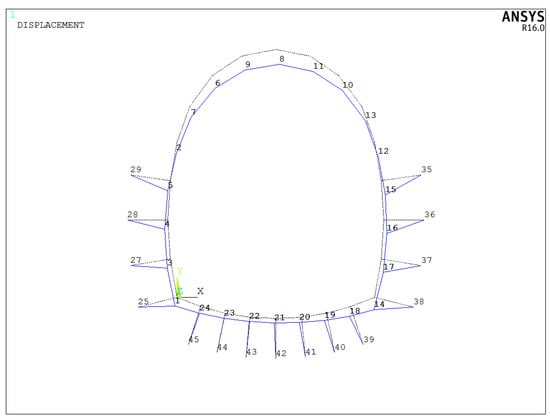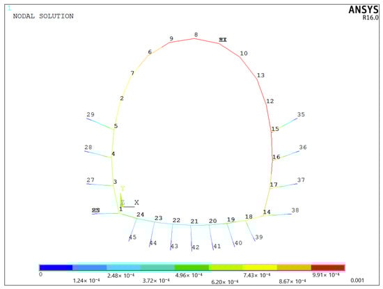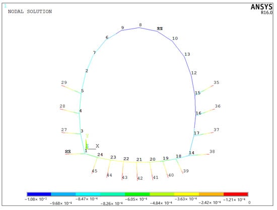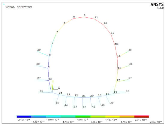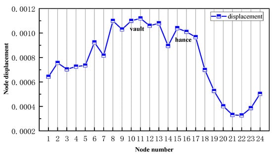 It can be seen from Figure 27 that the influence range of displacement vector synthesis is mainly the inner side of the lining, which also confirms that more attention should be paid to the horizontal displacement mentioned above. The maximum displacement occurs at the tunnel vault, followed by the displacement at the hance. The variation of displacement with numbering is shown in Figure 28.
