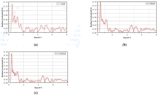 Acceleration time history curve of section 0 measurement point. (a) vault; (b) hance; (c) arch foot. (unit: cm/s2).
