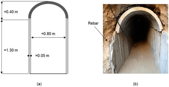 Tunnel dimensions were regularly minimal and allowed persons of average height to walk through while slightly bent. Dimensions of the tunnel support segments were estimated based on reports and open-source photos. Figure 1a shows estimated tunnel dimensions and support thickness, while Figure 1b shows an actual example of one of the Gaza tunnels. The out-of-plane dimensions of the support segments are assumed to be approximately 30 cm.