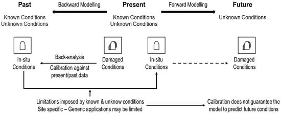 Despite the current knowledge gaps in geotechnical engineering, numerical analysis is often mistaken as a predictive tool [23]. However, the best use of numerical modeling is to study different scenarios and develop a risk strategy based on the modeled results. As shown in Figure 3, back-analysis is useful to understand processes and mechanisms, but even under the assumption that all conditions become known in the process (which for the problem under consideration is certainly not possible), there is no guarantee that the lessons learned from backward modeling could be used to predict future conditions. Therefore, rather than attempting to employ back-analysis techniques, we have analyzed the problem using a forward-analysis approach. The objective of our numerical simulations is not to determine precise material properties but to evaluate whether differences may exist between observed ground conditions and modeling results that cannot be attributed to changes in material properties alone.
