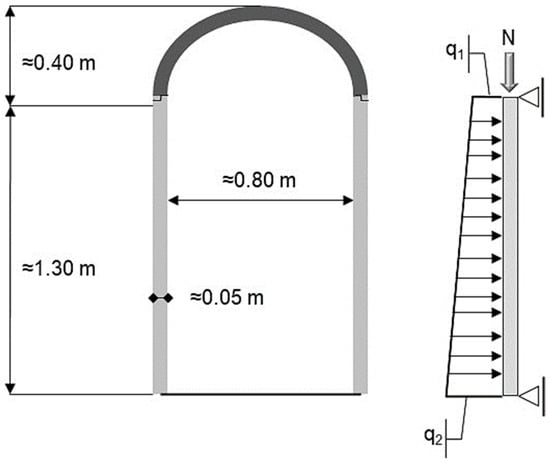 As discussed in Section 3, due to their significantly greater span, the wall segments are assumed to be the ‘weakest link’, i.e., they have the lowest capacity to carry the loads imposed by the ground; therefore, analysis in the section is focused on these elements. The wall segments are assumed here to be subjected to the earth’s lateral pressures. As the wall segments are bound by the roof and floor elements, they can be treated as a simply supported beam.
