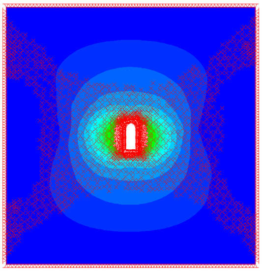 In addition to the models listed in Table 3, a model with no support was created and computed. As anticipated, the results of this model showed that the tunnel is not stable without support. The results of this model are shown in Figure 6. The elements that yield due to plastic failure are marked with ‘x’ signs. It can be noticed that the zone of plastic failure spreads outwards from the tunnel and reaches the model boundaries. This result indicates total failure, implying that without support, the tunnel will fail completely.