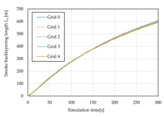 Since the reproducibility of smoke back-layering lengths is dependent on grid size, we conducted a grid independence analysis before the formal simulation. The simulation space for the grid analysis was 1000 m in length, 11 m in width, and 6.8 m in height with one portal closed. The average longitudinal velocity (Um) was set at 0 m/s. The heat generation rate was set to reach 10 MW (corresponding to the 20 MW convection heat in conditions where two side portals are open) at 30 s and to then keep the HRR steady. The simulation performance duration was from the start of heat generation until 300 s had elapsed. The grid divisions are detailed in Table 3.
