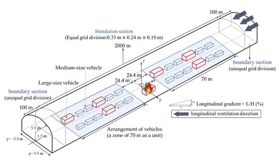 The simulation tunnel in this study was 2200 m in length, 11 m in width, (y-coordinate = −5.5–5.5 m), and 6.8 m in height (z-coordinate = 0–6.8 m) (see Figure 2). To completely calculate the area of smoke distribution, the x-coordinate of the calculation space was adjusted according to simulation cases, but the size of the calculation space was fixed.