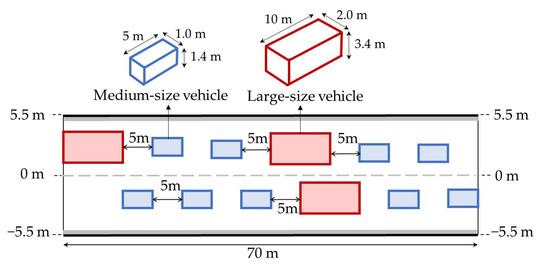 In the simulation space, the arrangement of vehicles was repeated with a zone of 70 m as a unit. The ratio of large vehicles (truck, bus) was assumed to be 25% (see Figure 3). The total congested vehicles was around 342 (some deviations depending on the simulation case). However, the occurrence of accidents blocks traffic, and jams start to form [44]. Non-congestion conditions soon become congested on the upstream side of the fire source. Furthermore, a vehicle’s deployment will influence smoke behavior and the back-layering length [7]. Thus, this study deployed the same vehicles in both congestion and non-congestion conditions to distinguish the difference between each ventilation mode. Two vehicle sizes were considered (medium size and large size). Vehicles were assumed to be rectangular obstacles, and the gap to the road surface was ignored. The height and width of the vehicle model were set in consideration of the ease of grid division. This study refers to the Cd value to roughly match various vehicles in the real world for calculating smoke behavior in tunnel fires so that the simulation results may be closer to those of a real situation. We compare the CdA values of real-size and model-size vehicles in Table 6. The CdA value is the multiplication of the air drag coefficient (Cd) and frontal projected area (A), which is used as one of the parameters that indicates the performance of automobiles. In further considering that the resistance coefficient of an object stationary on the floor is 0.2 to 0.3 less than that of an object (square with rounded corners) in the air (about 1.2), the Cd values of the model were set to 0.84 and 0.96. Two Cd values are provided because the Cd value differs depending on vehicle type. The actual sizes of the medium-sized and large-sized vehicles and the CdA values of the models roughly matched.