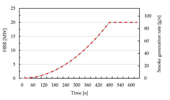 The assumed fire scale in this study was 30 MW (assuming 60% convective HRR, quadratic fire growth rate = 0.08 kW/s2). Figure 4 shows the change in the convective HRR and smoke generation rate with time. The fire source was assumed to be a heat generation area simulating the shape of the vehicle in taking the study by Huang et al., and the EUREKA 499 fire experiment as references [1,2]. As the fire developed, the heat generation area gradually enlarged, and the curve grew with the tendency of the time square until 480 s, then remaining constant after 480 s. The smoke generation rate was assumed to be the same as the HRR curve with the tendency of the time square. The smoke generation rate reached 90 g/s in 480 s, after which the smoke generation rate was constant. All the settings of the simulation conditions are listed in Table 7.