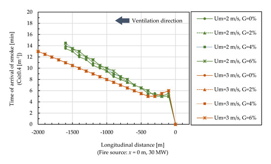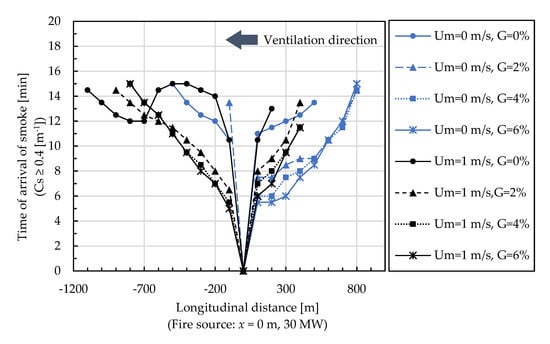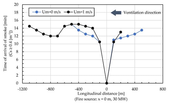 As shown in Figure 6, smoke descended on both upstream and downstream sides after 10 min when Um = 0 m/s. During the simulation time of 15 min, the region influenced by the descending smoke was around x = ±500 m. The velocity of the horizontal propagation of descending smoke (estimated by linear regression) was around 0.63 m/s on the downstream side and 0.36 m/s on the upstream side, which was a lower velocity than evacuees’ normal walking speeds of 1.33 m/s and 1.27 m/s in the tunnel (not influenced by smoke) under obstacle and obstacle-free conditions, respectively [46,58,59]. Thus, it is reasonable that the “zero-flow ventilation” strategy be adopted in Japan in keeping with the objective that tunnel users safely complete evacuation in 10 min.