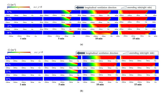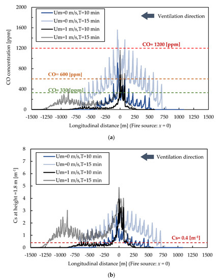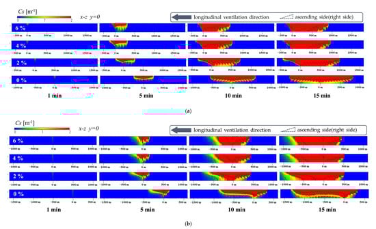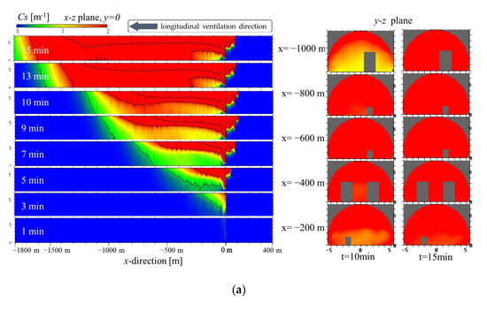 Figure 5 illustrates the smoke distribution (Cs) of the central longitudinal section (y = 0 m). The range of x is the total length of the simulation section of 2200 m, and the fire source is located at x = 0 m. The range of x was set to x = −1100–1100 m in the case of a longitudinal velocity (denoted as Um in the following content) of 0 m/s and was set to x = −1600–600 m in the case of Um = 1 m/s depending on the spreading of smoke. The longitudinal gradient was 0%. The time illustrated in Figure 5 is an average time within 30 s.