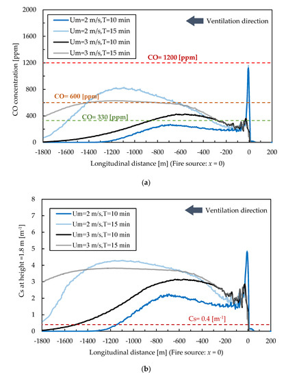 Figure 10 illustrates the distribution of CO concentration and Cs value in cases of Um = 2 and 3 m/s. During the 10 min evaluation time, a relatively low CO concentration was observed when Um = 2 m/s. At 15 min, the CO concentration over 600 ppm was in the region of x = −600 m to −1200 m for both Um = 2 and 3 m/s. However, the CO concentration was never over 1200 ppm for Um = 2 or 3 m/s. This indicates that the risk of toxic gas decreased as the longitudinal velocity increased.