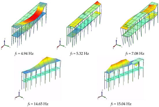 - The structure presents five modes in the range between 4.94 and 15.04 Hz: three global and two local vertical modes of the accessible roof;