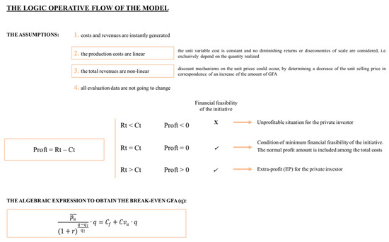 In particular, the model derives from the BEA logic. By considering the contexts of small urban centers or a new planning that includes a relevant number of new buildings and/or the functional reconversion of existing disused complexes, a real estate oversupply compared to local demand can be detected. Therefore, the hypothesis of the total revenue (Rt) linearity is inconsistent, as the ordinary inelasticity of property supply is not verified and selling prices will tend to become depressed. In general terms, according to the microeconomic theory of the firm, Rt is obtained by multiplying the quantity of the goods or services (q) by the unit selling price (pu), i.e., Rt = q ∗ pu. In the situations mentioned, the invariance of the unit selling price (pu = constant) to be used in BEA does not reflect the reference market. In fact, the new floor areas to be introduced are relevant and, according to the current real estate demand, abundantly satisfy the detected requests. This determines the need to analyze targeted discount mechanisms that justify the unit selling price decrease in correspondence of the amount of gross floor area (GFA) increase. In these cases, BEA standard assumptions could constitute a rough limitation for the outputs obtained and, therefore, could invalidate the entire analysis. In this sense, in the preliminary phases of decision-making processes the proposed evaluation model could help (i) public entities to identify, by considering different prices and costs scenarios, the GFA to be built and to be sold, capable of reaching the break-even point of the initiative’s financial balance, and (ii) private investors to quickly verify financial feasibility, by taking into account a more consistent framework of a simplifying hypothesis, in which the one related to revenue linearity is scarcely valid.