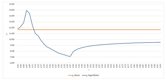 With reference to the variation rate r, this factor has been made to change in the range [0.01; 0.99]. The graph of Figure 2 shows the outputs obtained by the proposed model (q_logarithmic) for the different values of the rate r in the selected range, compared with the horizontal curve, i.e., parallel to the x-axis (q_linear) in the application case of the classical linear model of the BEA.