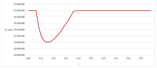 In Table 3, the combinations [q_logarithmic; Cf_max] by varying the rate r in the range analyzed [0.09–0.37] are reported, For the present case, these combinations define the Pareto frontier able to obtain the investment feasibility. It should be highlighted that, as market variability increases, even if the maximum sustainable cost of the private subject has a parabolic trend, the quantity of break-even building GFA decreases. Thus, the decreasing function of the unit price suggests avoiding going beyond a certain quantity of GFA, to preserve the condition that the unit market value is higher than the unit cost of production.