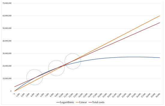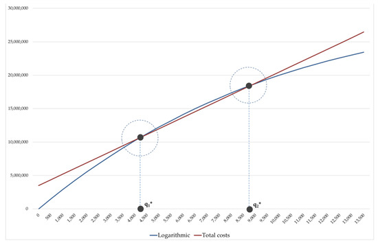 For variation rates between 0.07 and 0.39, the logarithmic model is unable to identify a GFA quantity capable of ensuring the condition of minimum feasibility for the private investor and, at the same time, of guaranteeing the payment of the charges provided for in Table 1 (Cf = EUR 3,500,000). In graphical terms, the revenue curve never crosses the total cost line. In this sense, the only possibility is that of providing a Pareto frontier of the optimal solutions, i.e., limit combinations [q; Cf_max], with Cf_max < EUR 3,500,000, such as to allow the private operator to reach the sustainability of the initiative. From the graphical point of view, a translation of the total costs line towards the x-axis should be performed, in order to identify the point of tangency with the total revenue curve, that corresponds to the GFA break-even amount.
