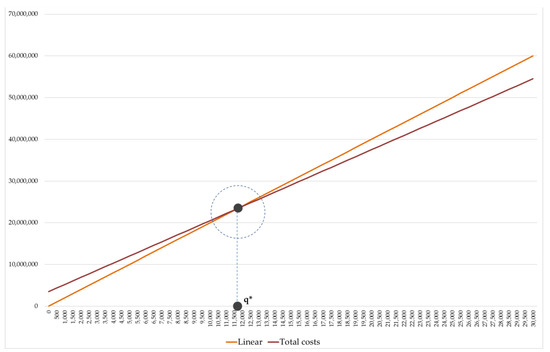 For a smaller quantity than that break-even identified, the feasibility to activate the initiative is not verified and the total profit is negative, i.e., an unprofitable situation is expected (Proft < 0).