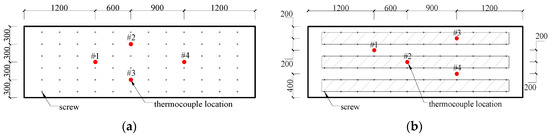 Mass timber products, especially cross-laminated timber (CLT), present the advantages of being environmentally friendly, lowering costs, and shortening construction periods [1]. Thus, they have been widely used in building structures [2,3]. Timber–concrete composite (TCC) boards are usually made of reinforced concrete boards and timber deck, with the two materials connected by shear connectors. Compared with the traditional timber boards, TCC boards demonstrate a higher rigidity and bearing capacity, improved vibration, and better behavior under seismic conditions [4,5]. Thus far, numerous studies have been carried out to study the structural performance of TCC boards at room temperature [6,7,8,9]. Mai et al. [6] studied the shear connectors in TCC boards and found that 45° inclined screw connectors demonstrated good stiffness and bearing capacity. Mai et al. [7] conducted static and dynamic tests to research the bending behavior of CLT–concrete composite boards using bi-directional, cross-inclined screws as shear connectors. Bao et al. [8] studied the structural performance of CLT–concrete composite boards with inclined, self-tapping screw connectors through testing and found that CLT–concrete composite boards exhibited great flexural performance.