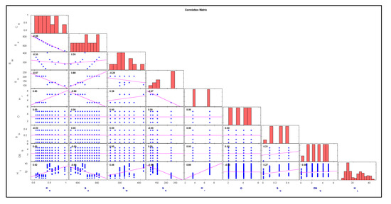 Table 1 expresses the range of values for the whole dataset. Moreover, Figure 1 depicts the scatter charts of each factor relative to the others. The values included in the correlation charts indicate the proportionality between the two parameters of interest. For instance, the correlation between the HL and CR is 0.62. Note that higher values indicate higher agreement in the behavior of the parameters and vice versa. According to these results, HT and SR with respective correlation values of 0.89 and −0.86 have the largest direct and adverse proportionality with the HL; the histogram of the input and target factors is shown in this illustration.