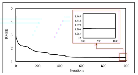 The network is yielded to the SOS algorithm to let it find the best weights and biases. In other words, the SOS trains the ANN. The hybrid of SOS–ANN is then fed with training data. Tuning the SOS parameters is implemented over 1000 iterations. In each iteration, to supervise the training process, the RMSE is calculated as the cost function. Thus, at the end of implementation, the optimization path can be shown by the rate of RMSE reduction. Moreover, the NP for this algorithm is set to 500. This value was opted for after trialing the behavior of the SOS with different populations and selecting the behavior that gave the smallest RMSE. Figure 2 shows the optimization path for the SOS in the present HL problem.