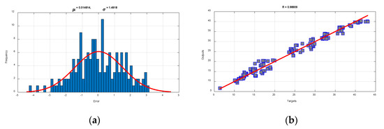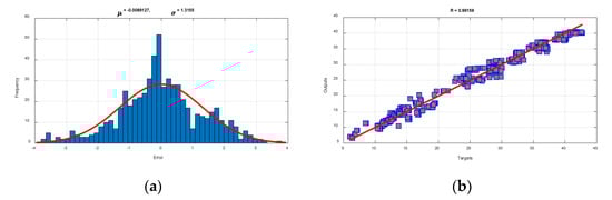 Figure 3 shows the training results in two parts depicting the histogram of errors and correlation chart. Note that an error value here is deemed as the simple difference between the expected and predicted HLs. The RMSE of training is 1.314 and the MAE is 1.004. Both of these accuracy indicators show a great performance because the training of the ANN has been performed with a very small error. It can also be deduced from Figure 3a that the frequency of error values around zero is much higher than errors with large magnitudes. Moreover, the correlation (i.e., R) between the expected and predicted HLs is 0.991. Knowing that an ideal correlation index is 1, this value is very close to the ideal, and indicates that the products of the SOS–ANN are concordant with reality.