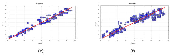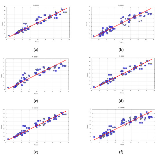 Figure 5. The correlations between the target HLs and training results for (a) PO–ANN, (b) HBO–ANN, (c) HGSO–ANN, (d) ASO–ANN, (e) SFS–ANN, and (f) CFOA–ANN (all values in kWh/m2).