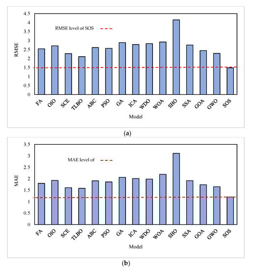 Figure 7. Column charts comparing the SOS with previous models in terms of (a) RMSE and (b) MAE, both in kWh/m2.