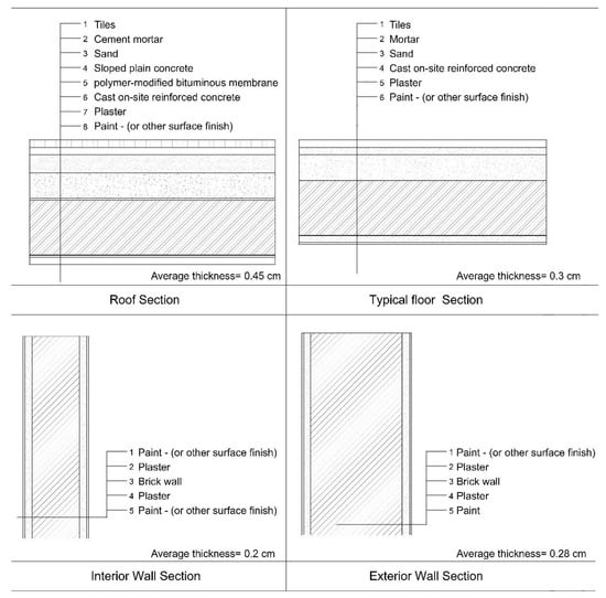 All the tested dwellings had cast-in-situ reinforced concrete structures using a traditional column, beam, or flat slab system. The exterior and interior walls are primarily built using hollow red bricks and plastered with a layer of mortar on both sides. Exterior walls are traditionally built with two layers of bricks (i.e., they are almost double the thickness of interior partition walls). Multiple coats of paint are the primary interior finishing material for all walls and ceilings. Exterior wall finishes varied between exterior paints and other surface finishes. The floors were mainly finished using tiles installed using cement mortar and sand. Roofs and wet areas (i.e., kitchens and bathrooms) featured a layer of a modified-polymer bituminous membrane as a water-resisting layer. Figure 3 presents the typical details of these building elements.