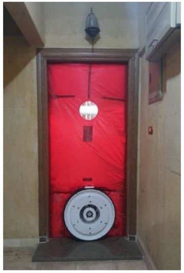 The tests were conducted between January 2022 and April 2022, according to ISO 9772. During the field testing, the locations’ ambient temperature, wind speed, and wind direction were recorded based on measurements conducted on the site at the tested dwellings’ level. The external dry bulb temperature, atmospheric pressure, and wind speed were measured at the main entrance door level. The indoor dry bulb temperature was measured in the geometric center of the space. A thermal image camera, FLIR E8-XT, was used to capture images to help identify the key leakage pathways. It is conceivable that the meteorological conditions in Egypt during the testing period did not significantly influence the testing results.