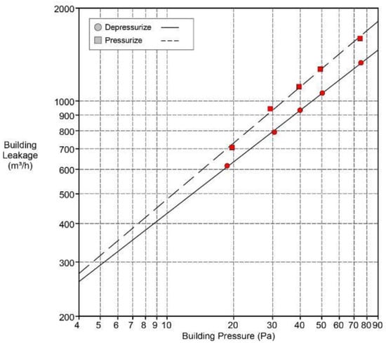All the tests reported in this study meet the requirements of ISO 9972 []. Namely, (1) the indoor–outdoor temperature differential multiplied by the building height was less than 250 mK; (2) the wind speed near the ground was lower than 3.0 m/s during the time of the testing; (3) the correlation coefficient between ΔP and the airflow was greater than 0.96 when determining the airflow coefficient C and airflow exponent n using a least squares technique; and (4) the airflow exponent ranged between 0.5 and 1.0. The first two conditions were checked by means of the ambient condition measurements completed for each test. To check Conditions 3 and 4, the corrections for zero flow pressure difference, actual and observed airflow through the fan, and internal/external air density differences were applied to the measured pressure differences and airflow rates. Then, the corrected airflow rate through the building envelope was plotted on a log–log plot against the corresponding pressure difference. Figure 6 shows an example of the graphs produced with a correlation coefficient of 0.999.