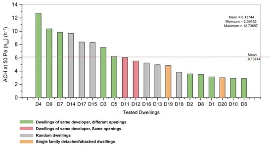Air change rate at 50 Pa and n50 for the tested dwellings (categorized as per Figure 1).