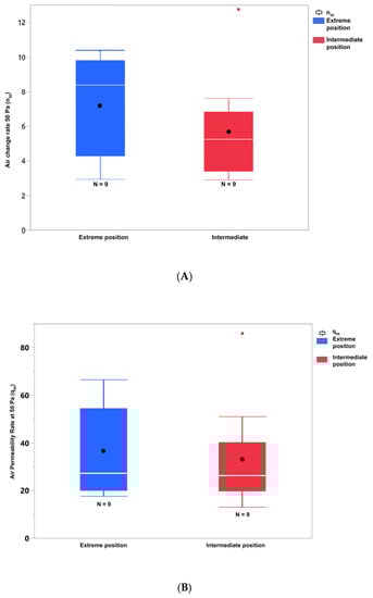 We first investigate the effect of the dwelling position in the building on air tightness. For this investigation, only dwellings in multi-unit residential buildings are considered (N = 18). The dwellings in extreme positions (i.e., ground and top floors, N = 9) are compared to the units in intermediate positions (N = 9). It is worth noting that all of the dwellings consisted of only four stories on top of the ground floor.