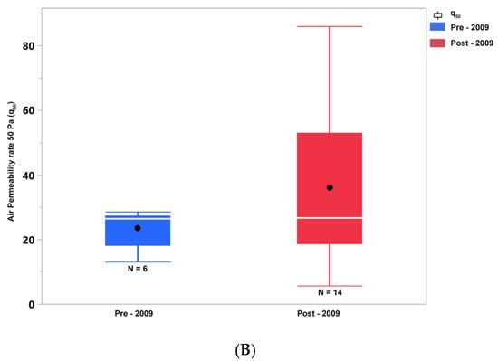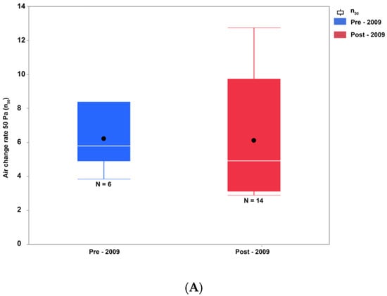 Box and whisker plots showing the distribution of (A) n50 and (B) q50 for dwellings constructed before and after 2009 (black dots show the mean value).