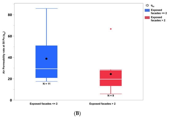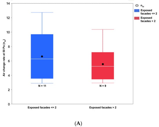 We then investigated the effect of façade exposure on airtightness. We divided the sample into two groups: dwellings with two or fewer exposed façades (N = 11) and dwellings with more than two façades (N = 9). As seen in Figure 10, dwellings with two or fewer exposed façades are leakier than those with more than two exposed façades, with an average n50 of 6.67 h−1 and an average q50 of 38.69 m3/(h∙m2) for dwellings with two or fewer exposed façades compared to an average n50 of 5.54 h−1 and an average q50 of 24.29 m3/(h∙m2) for dwellings with more than two façades.