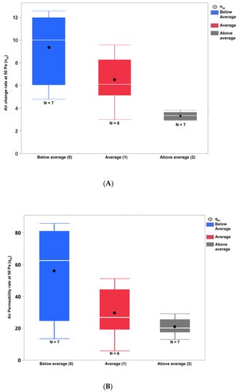 Finally, we investigated the effect of the observed fenestration quality on airtightness. While fenestration quality has not been directly investigated in previous work, other researchers have resorted to studying how regulation changes affect infiltration. These building regulations often include minimum specifications for windows and exterior doors, as well as stringent commissioning guidelines for fenestration finishes and installation. We compare the three groups, Below Average (N = 7), Average (N = 6), and Above Average (N = 7). The box and whisker plots in Figure 11 show differences in the n50 and q50 between the three groups, with below-average quality fenestration group having an average of 9.42 h−1 and 54.42 m3/(h∙m2), the average group 6.61 h−1 and 24.72 m3/(h∙m2), and above-average group 3.48 h−1 and 16.42 m3/(h∙m2). We compare the three groups using the Mann–Whitney U Test, which shows a significant difference in n50 and q50 at p < 0.05 between the above-average and average fenestration quality groups, and between the average and below-average fenestration quality groups. This indicates that the observed fenestration quality was a major determining factor in the air leakage characteristics of the dwelling.