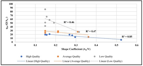 We plotted the linear correlation between the q50 and the shape coefficient (Figure 12) and the q50 and the specific aperture (Figure 13) based on each of the three fenestration categories (i.e., below average, average, and above average). We found the linear correlation between q50 and the specific aperture more robust and coherent. This is in line with the work of Sfakianak et al. [,,], where they found that window-related parameters, such as FLF, tend to provide more accurate predictions of leakage in tighter dwellings based on the testing they conducted in dwellings built with heavy construction materials.