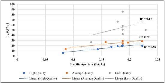 Linear correlation between q50 and specific aperture across the three different observed categories of observed fenestration quality.