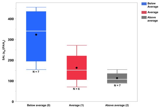 Box and whisker plots showing the distribution of SAL (q50/(FA/AE)) across the three observed fenestration quality categories (dots show the mean value).