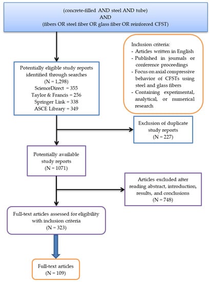 Relevant research articles were searched for using the keyword queries shown in Figure 1. Keywords were divided into two sections. The first part was to identify publications related to the CFST elements; at the same time, the second part was to limit the search results to articles investigating the axial compressive behavior of the CFST components in addition to fibers.